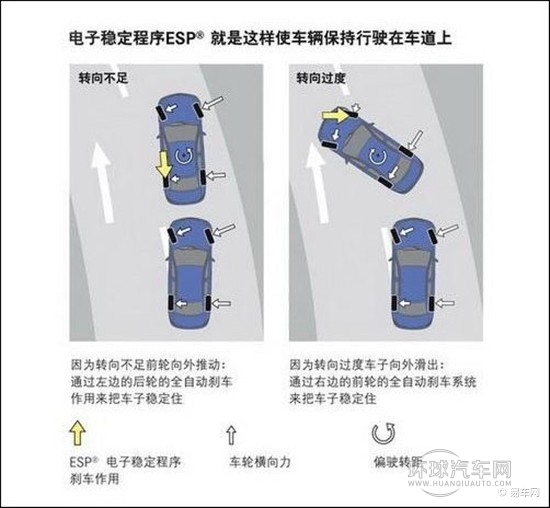 ESP整合了ABS和TSC能防止車輪在制動及啟動時打滑,并且增加了橫擺力矩控制—防側(cè)滑功能,從而避免事故發(fā)生。在緊急操控,如快速轉(zhuǎn)向、反向轉(zhuǎn)向、緊急變道、緊急避讓等危急情況下,ESP能夠幫助駕駛者保持對車輛的操控,以保證車輛行駛的穩(wěn)定性。