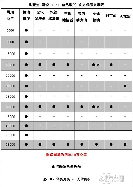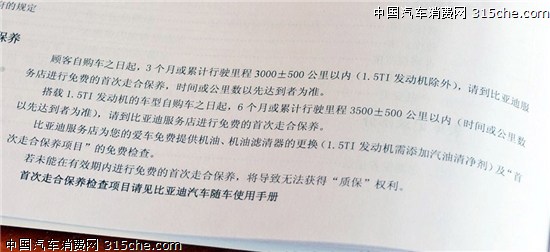 此外,比亞迪速銳可享免費首次保養,其中自然吸氣車型為3000±500公里以內進行,而1.5T渦輪增壓車型為3500±500以內進行。