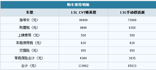 首先我們來看看全款購車需要多少費用。以上文推薦的1.5L CVT精英型和1.5L手動舒適版為例,購車費用明細如下: