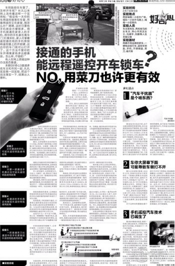 家住城西的車主馬女士對這種說法也很好奇。記者請她在自家小區也做了同樣的實驗。她說,她家住11層,自己的紅旗奔騰D70就停在樓下的院子里。她讓兒子下樓拿著一部手機站到車邊,自己在樓內拿著遙控鑰匙對著手機話筒按開鎖鍵,兒子告訴她車毫無反應。她說:“為什么會這樣,這說法看起來好傻好天真哦!”