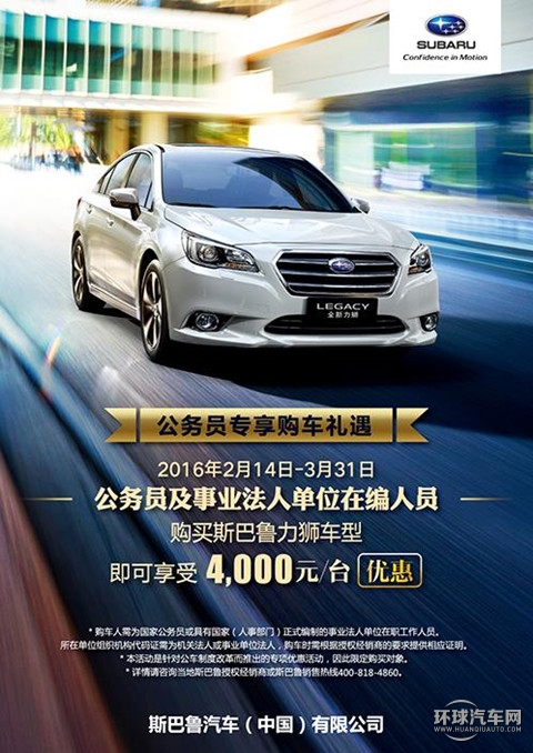 3.2016年2月14日-3月31日,凡公務員及事業法人單位在編人員,購買斯巴魯力獅車型,即可享受4000元/臺優惠。
