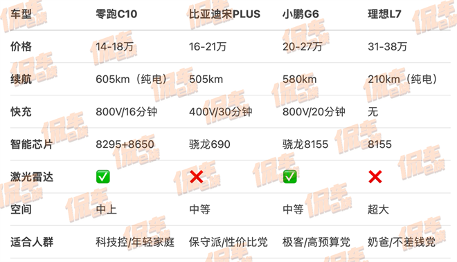 首先,零跑C10的定位很明確:14萬級純電/增程雙動力SUV。純電版起售價預計14萬左右(對標比亞迪元PLUS、深藍S7),頂配帶激光雷達的版本可能沖上18萬(正面剛小鵬G6、極氪X)。增程版價格估計再低1-2萬,主打“可油可電焦慮退散”。橫向對比同價位競品,這價格配上800V+605km續航+激光雷達,屬實是“貼臉開大”。