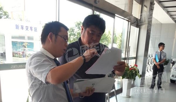 郭師傅提車前跟銷售顧問在辦理手續