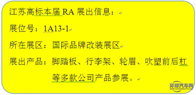 在本屆RA改博會的改裝配件用品展區(qū),江蘇高標(biāo)科技發(fā)展有限公司將攜帶腳踏板、行李架、輪眉、吹塑前后杠等多款公司產(chǎn)品參展,產(chǎn)品主要用于SUV、MPV、吉普車、皮卡車等車型。