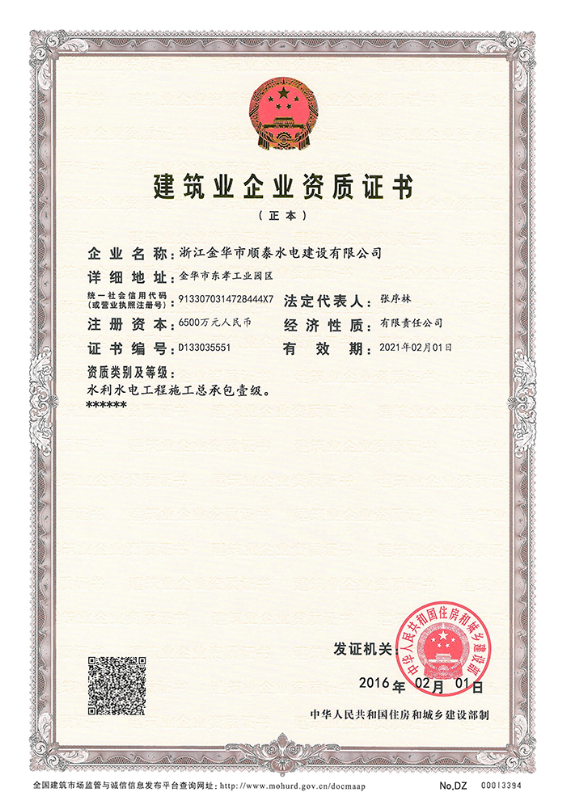 建筑業企業資質證書正本