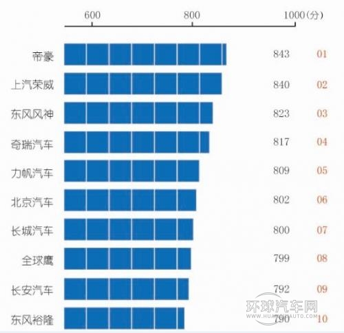 2013自主品牌銷售滿意度指數(shù)排名(前十)