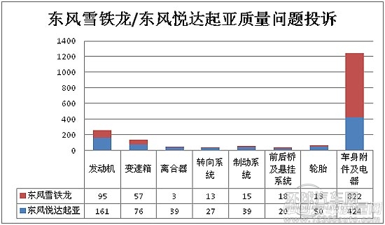 從質量問題上來看,東風雪鐵龍和東風悅達起亞,主要投訴問題都集中在車身附件及電器部分中,顯然雪鐵龍投訴量要更多一些;而除車身附件及電器部分外,其余各項東風悅達起亞投訴量均高于東風雪鐵龍。可見,東風雪鐵龍的投訴問題更為集中,共性問題的存在更為明顯;而起亞多個部分投訴都有涉及,說明出共性問題外,整體質量可靠性相比較而言有所不足。