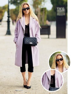 TIPS:想游走在時尚前沿,并非要你凌駕于時尚,也絕非讓你一味跟風;而是要讓時尚為我所用。比如,圖中這一身行頭就堪稱高段位搭配。深V的黑色內搭與知性的方形金屬鏈條包,避免了將馬卡龍色穿出稚嫩感,令整身柔和而干練。此外,花邊太陽鏡令時尚指數不斷攀升,而半透明的蕾絲胸衣則隱隱透出你的性感魅力。以此為參照,對于怎樣嫻熟、恰到好處地駕馭馬卡龍流行色系,你應該心中有數了吧。時間有限,趕緊扎進各大商場的試衣間,為你自己量身定制一身驚艷行頭吧。