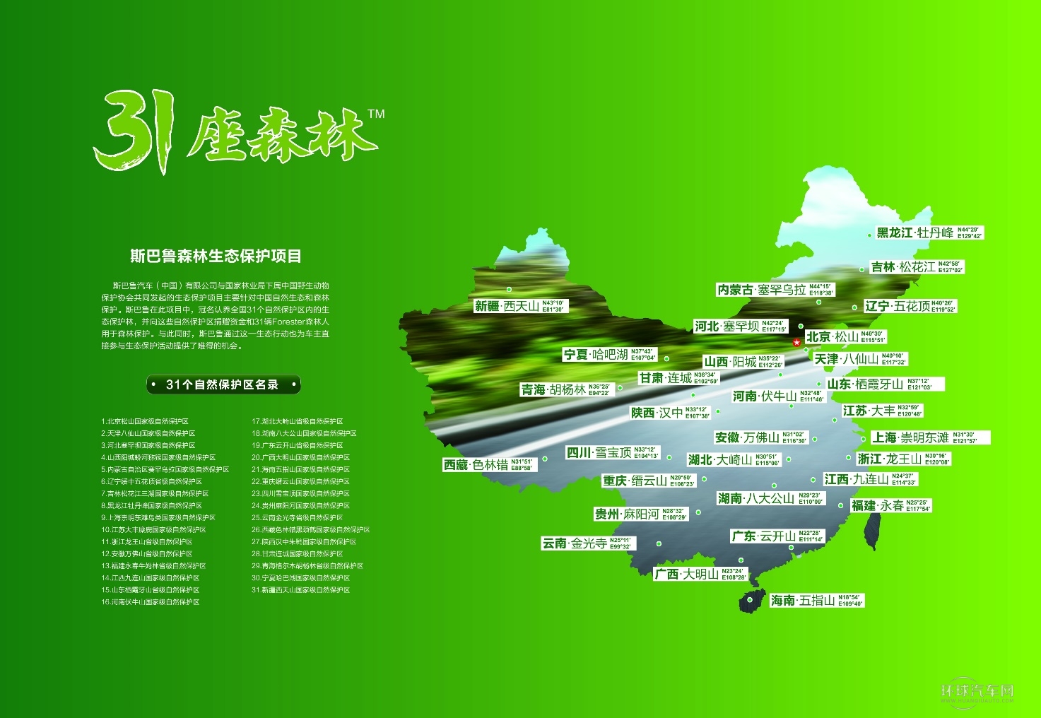 “31座森林星之旅”是由斯巴魯汽車(中國(guó))有限公司依托“斯巴魯森林生態(tài)保護(hù)項(xiàng)目”,為宣傳森林生態(tài)保護(hù)理念而推出的首個(gè)大型活動(dòng)。斯巴魯以自然生態(tài)保護(hù)理念結(jié)合旗下堪稱“遠(yuǎn)行專家”的SUV車型搭建“生態(tài)遠(yuǎn)行”的平臺(tái),讓所有車主在以31座森林為目的地的遠(yuǎn)行中實(shí)現(xiàn)與大自然的接觸,感受森林帶來(lái)的樂(lè)趣并在遠(yuǎn)行中喚醒對(duì)綠色森林的生態(tài)保護(hù)意識(shí)。2013年7月至11月間,“31座森林星之旅”活動(dòng)在全國(guó)開展以來(lái),受到了社會(huì)各界人士的廣泛關(guān)注和支持,而全國(guó)各地?zé)o數(shù)斯巴魯車友通過(guò)這一活動(dòng)進(jìn)入國(guó)家級(jí)自然保護(hù)區(qū)探訪,在感受大自然樂(lè)趣的過(guò)程中體會(huì)到自己所應(yīng)擔(dān)負(fù)的生態(tài)保護(hù)責(zé)任。2014年度“31座森林星之旅”第二季已經(jīng)再度啟程,現(xiàn)即將登陸上海!8月30日,重磅演繹,精彩紛呈的內(nèi)容拭目以待。