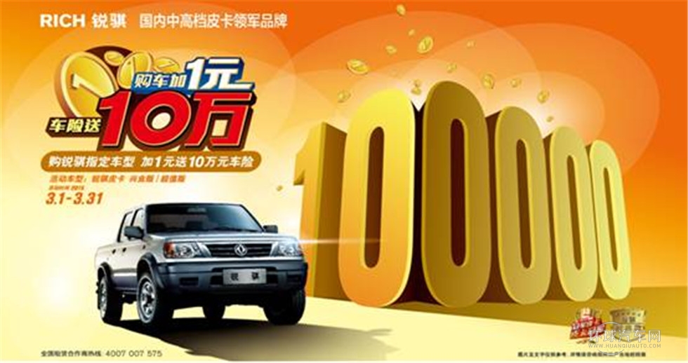為感恩回饋廣大客戶對鄭州日產一如既往的支持,鄭州日產重磅推出“加1元,享10萬”的購車促銷活動。凡是在2015年3月1日至3月31日期間,購買鄭州日產銳騏皮卡指定車型(超值版、興業版),并額外支付1元錢,即可獲得由鄭州日產贈送的價值10萬元保額的第三者責任險。1塊錢,換的不僅僅是保險,更是一份駕駛的安心。就算“duang duang”已經銷聲匿跡,“黑藍”和“白金”亦已分出了勝負,但1塊錢換得的安心將會一直存在。