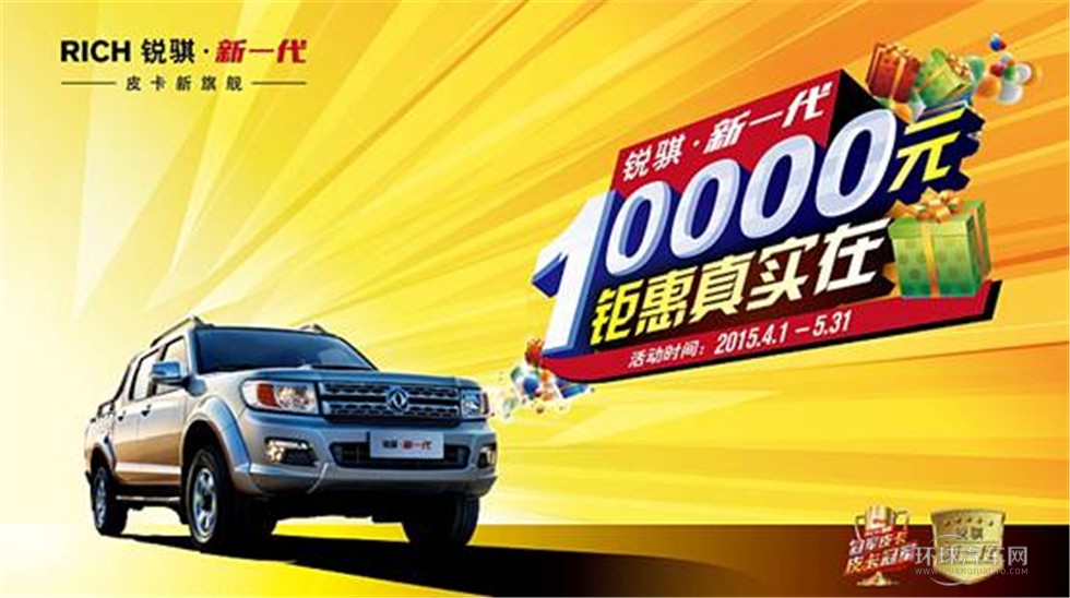 還記得在烈烈寒風中向世界Z高沙峰沖刺的銳騏新一代皮卡的颯爽英姿嗎?是不是早已“芳心暗許”決定入手一輛,想象在2015年的春游踏青之時如沙峰頂端上的銳騏新一代一樣,狠狠地撒一場野?那么,現在機會來了。在4月1日到5月31日期間,凡購買銳騏新一代皮卡,就可享到由鄭州日產提供的價值10000元的巨額優惠,不用再想象,直接開著銳騏新一代去釋放激情吧。