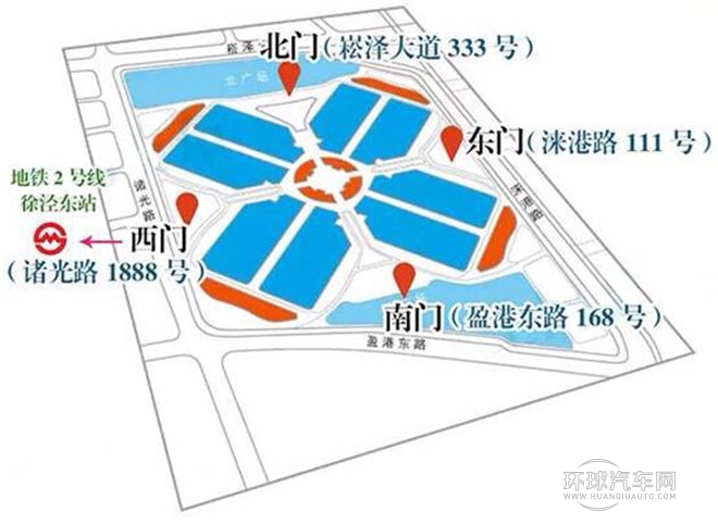展館西門位于諸光路1888號(hào),緊鄰地鐵2號(hào)線徐涇東地鐵站。東、南、西、北四門均對(duì)外開放,入口參照下圖。