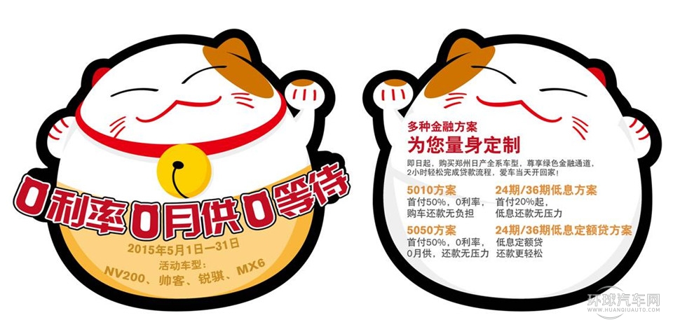 2015年5月1日至31日期間,進入全國鄭州日產專營店購買東風風度MX6、帥客、NISSAN NV200、銳騏皮卡四款明星車型中任意一款,即享“5050”和“5010”等半價提車優惠政策,消費者只需首付50%,便可享受“0利率”分期購車,剩余費用可選擇一年后一次性付清或一年內分12期還清。
