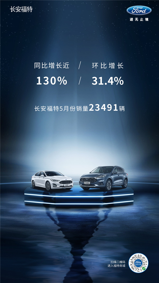 (2020年6月4日)長安福特全國銷售服務機構(簡稱NDSD)今日宣布2020年5月單月批售23491臺[1],實現5月同比、環比雙增長,其中同比增長近130%、環比增長31.4%。2020年以來,長安福特單月批售銷量首次突破兩萬臺。