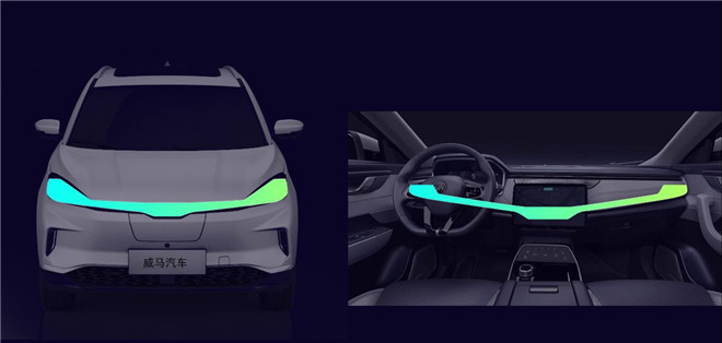 與傳統燃油車相比,新能源汽車沒有了發動機的空間負擔,在車內空間重構、整車電動化等方面為設計師提供了更多想象的可能。如何讓用戶從設計上,快速識別一輛智能電動汽車,成為各車企思考的課題。威馬汽車獨創智能交互動態Logo燈,由五條柱狀“極光色”LED燈組成,富有節奏的跳動兼具呼吸效果和流水特征,不僅在行車間成為其智能電動汽車身份的象征,更兼具實用性,為用戶帶來車輛充電、解鎖、上鎖等 7種行車模式的智能提示。