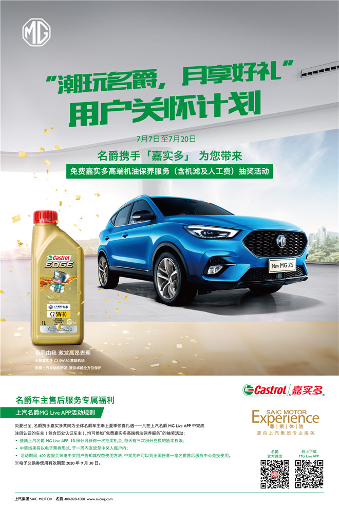 作為一個always YOUNG的百年國際品牌,名爵給車主帶來的獨一無二福利全年不間斷,實力寵粉,非他莫屬。繼在名爵MG Live APP預約保養和維修、超時送保養,7.7折購全車雨刮片、免費送“雨刮精泡騰片”等活動之后,又推出拼手氣抽獎活動。登錄MG Live APP參與抽獎,即有機會贏取嘉實多高端機油保養(含機濾及人工費)套餐。想成為愛車的“好基友”?從給TA“喝”好機油開始吧!