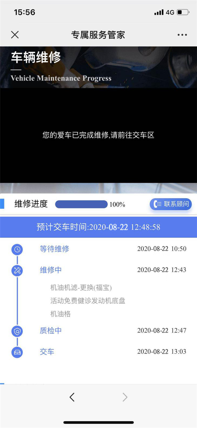 別人駕駛你的愛車,不放心?你可以打開短信鏈接,實時關注愛車動向。安全到達4S店后,服務顧問也會通過電話為你清晰解釋每一項維修保養項目對應的時間、效果。服務結束后,你只需要通過二維碼遠程付款即可。隨后服務人員會按照預定路線,將愛車送回指定地點,并與你再次確認車輛狀態。直到保養完成,可能你的一頓火鍋還沒有吃完。