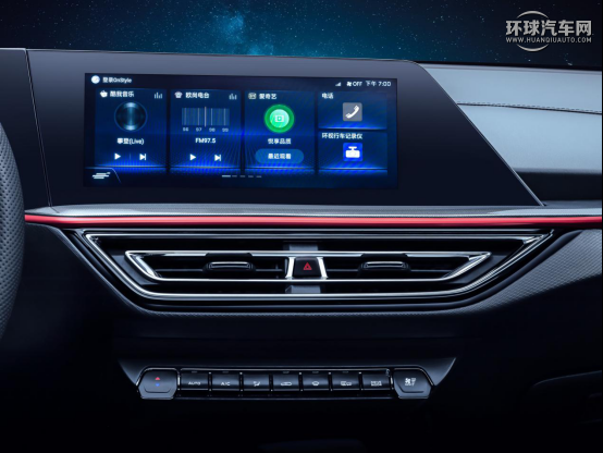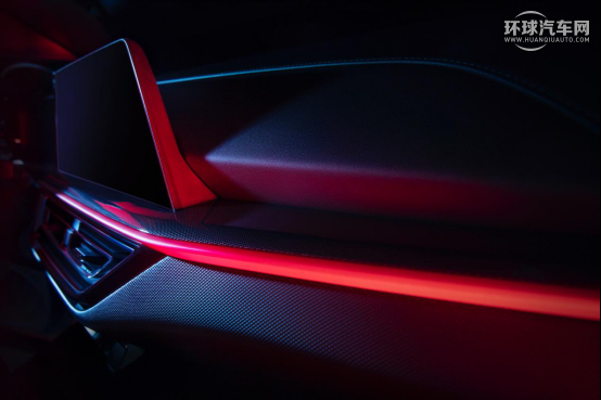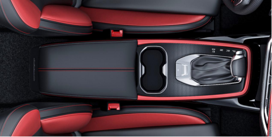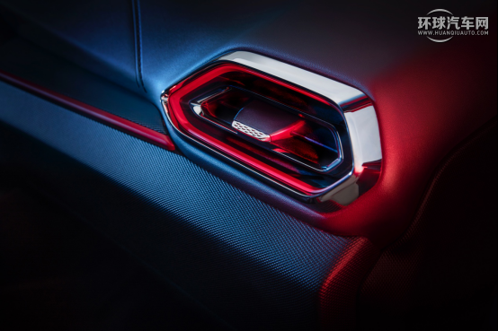 回形空調出風口,聲微風柔,采用了三層鍍鉻設計,紅色內飾點綴,與中控競速光帶相呼應,左右對稱分布,這也是為了中和不規則設計帶來的失衡,實現視覺上的平衡。