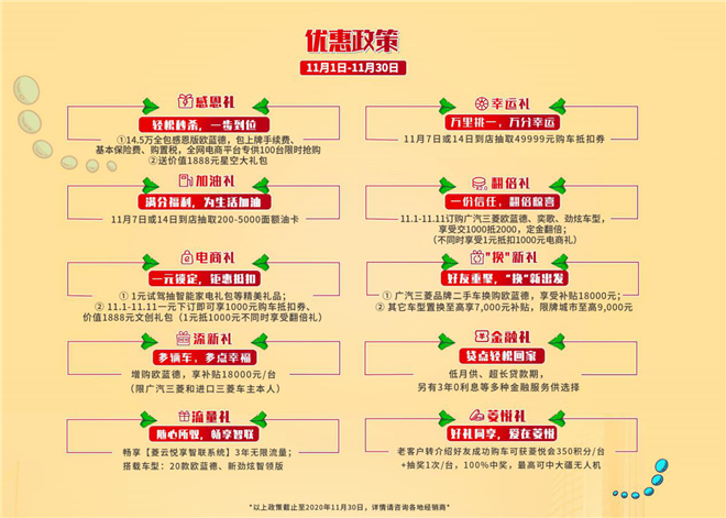 適逢雙十一到來(lái)之際,廣汽三菱還為廣大消費(fèi)者準(zhǔn)備了終極“麻辣十重禮”。即日起,僅需14.5萬(wàn)即可全包閃購(gòu)歐藍(lán)德,電商平臺(tái)專供100臺(tái)限時(shí)搶購(gòu)。11月7日或14日到店還有機(jī)會(huì)抽取49999元購(gòu)車抵扣券和200-5000面額油卡。11月1日至11日期間,訂購(gòu)歐藍(lán)德、奕歌、勁炫車型,享受交1000抵2000“翻倍禮”;電商平臺(tái)下訂車型還可享受1000元購(gòu)車抵扣券、價(jià)值1888元文創(chuàng)禮包等驚喜好禮。此外還有多重?fù)Q購(gòu)補(bǔ)貼、多項(xiàng)金融服務(wù)等豐富福利,更多優(yōu)惠詳情請(qǐng)咨詢當(dāng)?shù)亟?jīng)銷店。