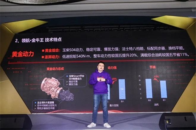 福田汽車集團時代事業部研發副總裁、技術研究院院長王宇對領航·金牛王進行解讀,王宇指出領航·金牛王重新定義用戶場景,其貨廂尺寸覆蓋4.8-6.8米,可滿足散雜、綠通、冷鏈、專用改裝等用戶的個性化定制需求。在承載性能方面,匹配200馬力玉柴發動機,扭矩720N·m,起步快、加速快、爬坡猛;采用700L高強鋼輥壓車架、高強度板簧及后橋,應用福田汽車領先的蟻象輕量化技術,“輕而有質”,可合規裝載12噸以上,上牌無憂、上路無憂、年檢無憂、綠通無憂;前盤制動器、自動緊急制動系統、電子穩定控制系統、胎壓監測等主動駕駛安全配置以及主駕安全氣囊,前輪爆胎應急裝置等被動安全配置,有效保證了高承載行駛時更安全的保證;同時,智能座艙、減震座椅等十大組合配置,更帶來了遠超同級車型的舒適體驗;整車的TCO也超預期達到了輕卡的成本、中卡的收益;輕松實現用戶創富自由。