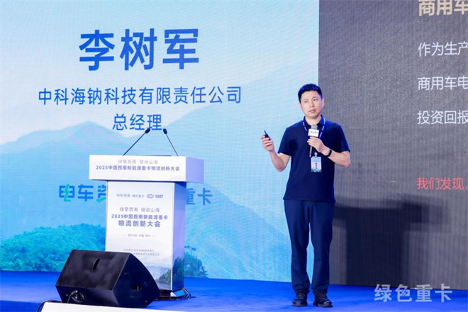 中科海鈉科技有限責任公司總經理李樹軍發表了《低溫快充長壽命:鈉離子電池電動重卡的性能優勢與成本重構》的主題演講,他指出,鈉離子電池選擇以商用車,尤其卡車行業作為突破口,其發展進程已明確:2023 年實現乘用車整車交付,2025 年正式進入商用階段。