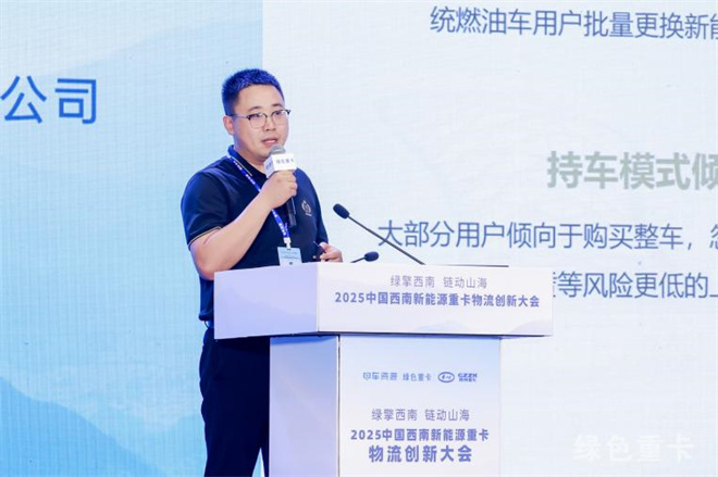 唐山市中嶸供應鏈管理有限公司副總經理付浩發表了《運費‘油改電’如何求發展》的主題演講,他分析西南新能源貨運現況:新能源重卡滲透率持續上漲,運價持續下跌,持車模式傾向購買,運力合同期短。
