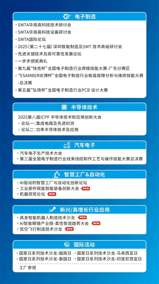 在AI終端、圖像傳感、半導(dǎo)體芯片等關(guān)鍵領(lǐng)域持續(xù)領(lǐng)跑,成功實現(xiàn)技術(shù)創(chuàng)新與多場景應(yīng)用的深度融合。NEPCON ASIA 2025針對具身智能機(jī)器人、低空飛行、智能工廠、機(jī)器視覺、半導(dǎo)體、電子制造等領(lǐng)域開展40場會議論壇及賽事活動,深度整合國內(nèi)外行業(yè)協(xié)會組織、專家、科研人員、資深從業(yè)者、行業(yè)應(yīng)用終端及行業(yè)媒體等資源,探討電子制造現(xiàn)狀與未來發(fā)展趨勢,實現(xiàn)業(yè)務(wù)的持續(xù)增長,共同拓展市場新未來!