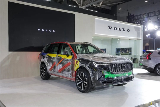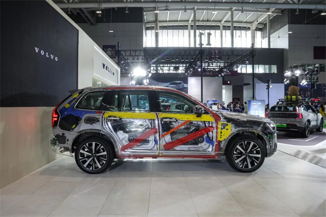 在展會上,沃爾沃展出了一臺XC90透明版安全展示車,通過分色涂裝的白車身,將內部的安全結構和用料“透明化”地呈現給觀眾。車身以不同顏色標示材料:綠色部分為鋁合金,暖色系為高強度鋼,其中紅色的硼鋼強度高達1500兆帕,并通過“6橫6縱”籠式車身結構保障乘員生存空間。該車在車頭、車尾及B柱下端等關鍵位置設有潰縮吸能區,用以吸收和緩解碰撞沖擊。制造工藝上,全車約6000個焊點全部經過100%檢測,且沃爾沃每6周會抽取一臺白車身進行“撕毀”檢測,從源頭確保焊點質量與車身結構的絕對穩固。