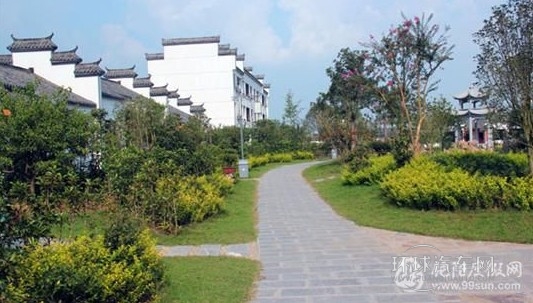 進(jìn)入園內(nèi),確有不識(shí)此園真面目,只緣身在此園中的感受。山中有園,園外是山,說是五百余畝雖不可信,說是千畝開外也不可知。只見白墻紅瓦的徽派建筑映掩在綠樹叢中,以寬闊高朗的接待大廳為中軸線,形成系列瀏覽區(qū):可供游客休閑度假的徽派仿古豪華別墅群、可供文人墨客激情揮毫的場所九華書舍、充滿傳奇色彩的佛教文化院高庵古寺、搬遷落戶的明清時(shí)期古村落、休閑觀光垂釣園,從北至南,依次排列,布局合理,錯(cuò)落有致。