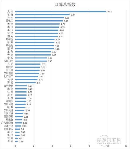 《報告》顯示:從2013-2014年度汽車行業網絡口碑總體上來看,大眾憑借其在網絡中的高品牌知名度和消費者互動度,位居總榜單第一名。福特和鈴木緊隨其后,分別位列第二和第三名。歐美盡管其品牌知名度指數進入前十榜單,但其他多項指標卻呈低值分數出現,影響其在口碑總指數成績。