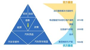 看完左側的三角形,我們看看右側這個圖,這是汽車產業過去30年的供求分析。從1984年桑塔納時代,那個時候產能是王道,批條子才能買車,不用談價格和產品技術。到了1997、98年,廣本和上海通用進入市場,汽車市場才有了競爭。這種競爭到了2006年比亞迪造出F3,價格戰成為主流,這場價格戰一直打到今天,主要的整車制造商在新車利潤方面都在減少,早晚會趨近于零。到2014年,已經有美國的電動智能汽車特斯拉在中國市場上銷售,本土的電動車也開始批量上市,這類車型必須要考慮消費者的滿意度,否則互聯網上的口碑會毀掉產品??梢灶A見到,未來汽車產業一定是擔當出行服務解決方案供應商,而不是非得賣車給消費者。
