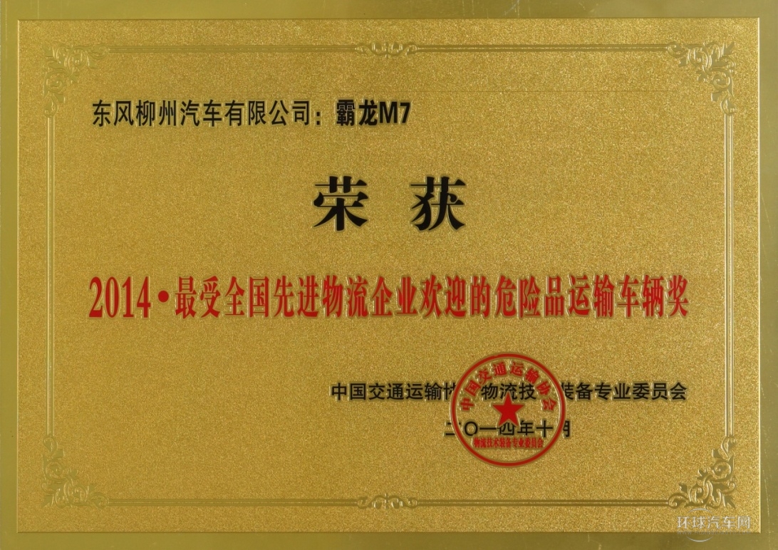近日,由中國交通運輸協會物流技術裝備專業委員會組織舉辦的“2014年度最受全國先進物流企業歡迎的技術裝備大獎”評選結果正式揭曉。由東風柳汽生產的高速物流重卡——霸龍M7榮獲“2014·最受全國先進物流企業歡迎的危險品運輸車輛獎”。