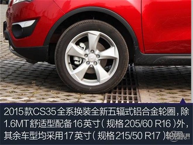 2015款CS35的輪轂造型發生了改變,升級為了大五幅輪圈,顯得更加運動。作為一款都市小鋼炮,215 50R17的高規格輪胎為CS35帶來了充足的抓地力,提升了主動安全性。