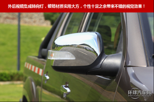 車窗兩側鍍鉻“亮銀色”大尺寸后視鏡集成轉向燈,且與下部雙側銀色腳踏相互呼應,增加美觀的同時,還不忘易用性及安全性。