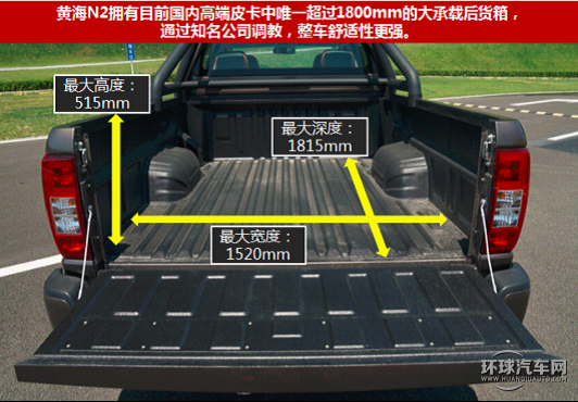 黃海N2的貨箱尺寸為1815mm×1520mm×515mm,是國內高端皮卡中唯一超過1800mm的大承載后貨箱。通過本特勒公司底盤調教,整車舒適性更強。在貨箱內部,還噴涂了具有防腐蝕、防刮蹭的黑色PE貨箱寶,令美觀與實用性大大增加。