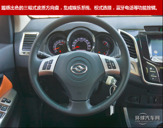 皮革包裹的方向盤握感出色,尺寸大小適中,兩側集成了娛樂系統音量調節、模式選擇以及藍牙電話等多功能按鍵。