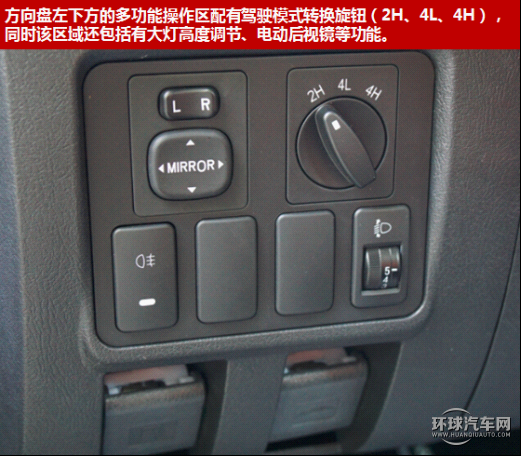 黃海N2提供三項駕駛模式選擇,2H(兩驅高速)表示車輛正常的后驅行駛,此模式下可不受速度限制,且有助于提高燃油經濟性,適合大多數城市路面;4L(四驅低速)作為極限越野的必備條件,用于沼澤地、沙漠等極其惡劣的環境;4H(四驅高速)模式可輕松應對寬廣通暢的越野路面,在雨天行駛時車況表現穩定,操控性極佳。