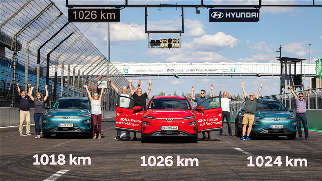 2020年7月22日至24日(當地時間)在德國進行的賽道試駕中,3輛現代汽車KONA EV(中文名:北京現代昂希諾純電動)分別完成了1026km、1024.1km和1018.7km的行駛距離, 超額完成了單次充電行駛里程滿1000公里的目標。同時由于三臺車百公里耗電量分別僅為6.28、6.25和6.24kWh,遠低于WLTP(全球統一輕型車測試規程)每百公里14.7kWh的標準值,因此KONA EV憑借著最高1026km的里程也刷新了64kWh容量電池的續航里程紀錄。