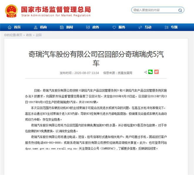 8月8號,據(jù)國家市場監(jiān)管總局官網(wǎng)發(fā)布公告稱,奇瑞汽車決定自2020年8月15日起,召回部分2013年7月13日- 2017年9月13日生產(chǎn)的奇瑞瑞虎5汽車,共計(jì)190352輛。召回原因則是在上述生產(chǎn)日期中的奇瑞瑞虎5車型,存在無法啟動(dòng)或動(dòng)力中斷等安全隱患。