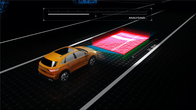 如今,DS工程師團隊基于DS在懸架領域的深厚積淀,研發出能夠根據前方路面預先調節軟硬程度的懸架。即便在顛簸路段,DS也能為用戶創造如履平地的體驗,因此DS形象地將其命名為——魔毯自適應懸架系統。在車載攝像頭的幫助下,該系統能夠掃描分析車輛前方5米的路面起伏情況,并對車輛的四個車輪持續進行獨立控制。