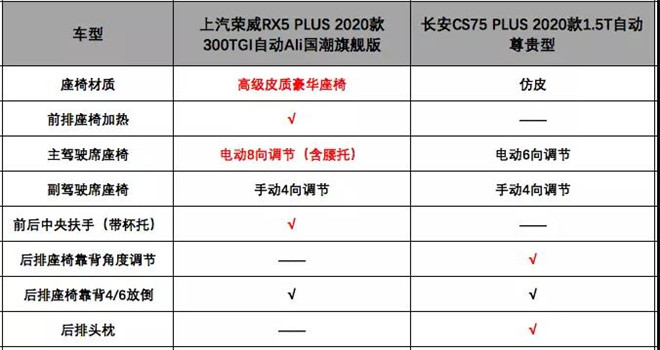 大空間已經安排妥當,再看看舒適性。以榮威RX5 PLUS 2020款300TGI自動Ali國潮旗艦版(官方指導價13.08萬元)與長安CS75PLUS 2020款1.5T自動尊貴型(官方指導價13.19萬)為例,參見下圖來看,榮威RX5 PLUS的座椅材質更好,不僅觸感柔軟且更耐臟、耐磨,再加上符合人體工程學設計的座椅,讓每一次出行都倍感愜意,無懼旅途顛簸。此外,榮威RX5 PLUS還多出前排座椅加熱功能、前后中央扶手(帶杯托)配置等,主駕座椅還支持電動8向調節,這些對日常駕乘來說更友好。說到內飾部分,除了抗菌納米面料頂棚的加持,榮威RX5 PLUS還采用了豪華品牌的靜音用料標準,雙層隔音原理,打造專屬的靜謐空間,整個大寫加粗的“舒適”!