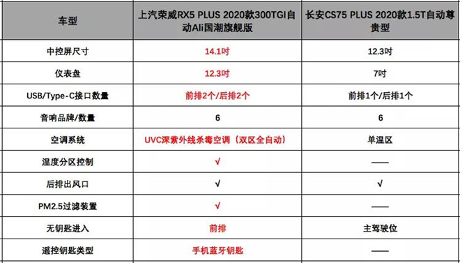 另外,榮威RX5 PLUS搭配了全球首創的UVC深紫外線光學殺毒空調和PM2.5過濾裝置,非常適合當下特殊環境,90秒即可實現95%的殺菌效果,打造主動凈化的健康座艙。而長安CS75 PLUS雖說擁有智能健康氣候控制系統,但其僅在頂配車型配備,對比之下相形見絀。