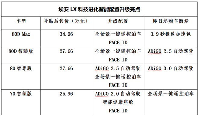 更聰明的泊車系統、更先進的自動駕駛系統、更前衛的座艙科技,正在讓人們的出行更加輕松、便捷。而本次埃安科技進化發布的最大亮點之一,正是智能層面的進化。在原有產品高科技產品力的基礎上,埃安LX科技進化各配置車型將全面升級最高規格的ADiGO自動駕駛系統,并增配全球唯一全場景一鍵遙控泊車,讓全球最頂級的智能科技觸手可及。以埃安LX主力車型80智尊版為例,其不僅新增了ADiGO 2.5自動駕駛系統和一鍵遙控泊車,即日起購車還可升級ADiGO 3.0自動駕駛套裝。
