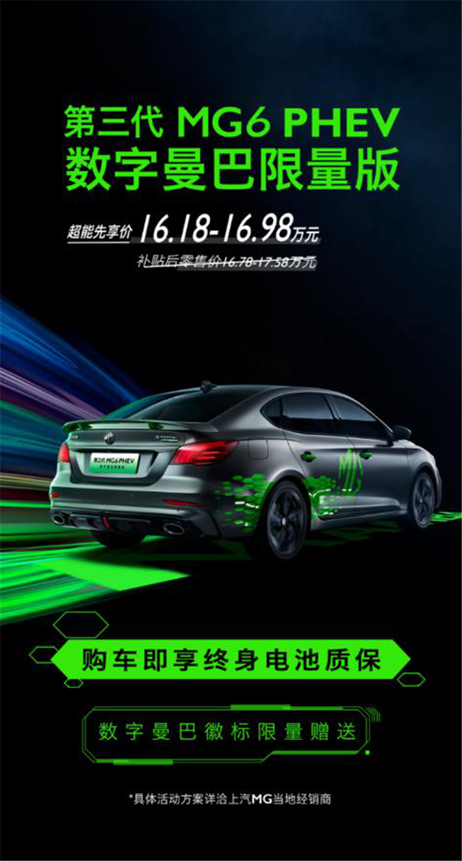 第三代MG6數字曼巴限量版共推出三款車型,官方指導價12.68萬元-14.28萬元,在6000元紅包優惠的基礎上,超燃驚喜價僅需12.08萬元-13.68萬元,現在購車還可1999元搶“限量尊享萬元權益包”,包括終身原廠質保、2年7折回購、首年輪胎無憂保障;第三代MG6 PHEV數字曼巴限量版共推出兩款車型,官方指導價16.78萬元-17.58萬元,在6000元紅包優惠的基礎上,超能先享價僅需16.18萬元-16.98萬元,購車即可享終身電池質保。消費者購買第三代MG6數字曼巴限量版車系還可享專屬限量徽標。
