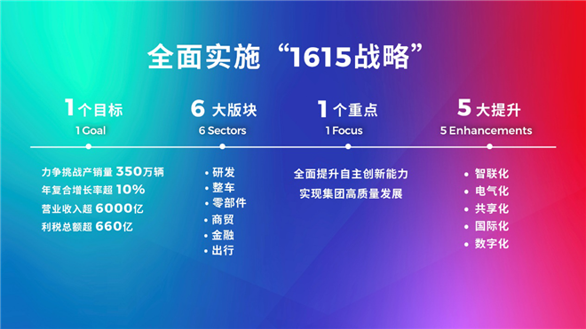 完成1個目標,十四五期末,挑戰汽車產銷量達350萬輛,全集團實現匯總營業收入超6000億元,利稅總額超660億元,年復合增長率超10%,市場占有率超12%;新能源汽車產品占整車產銷規模超20%,成為行業先進的移動出行服務商;
