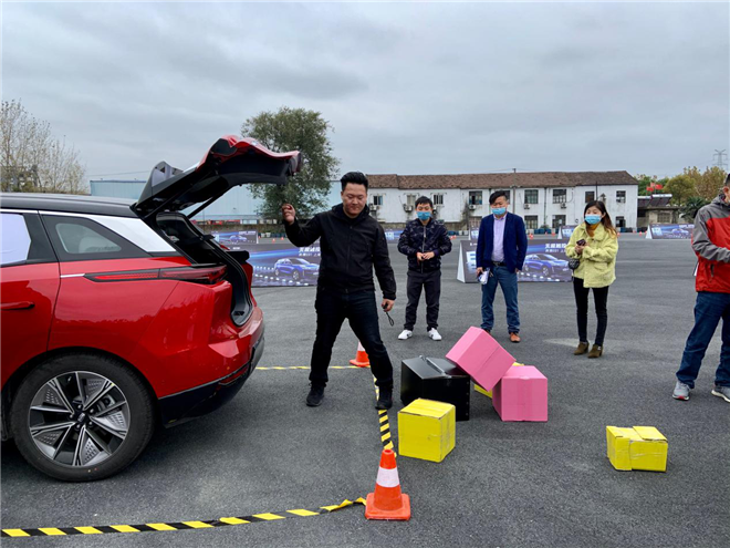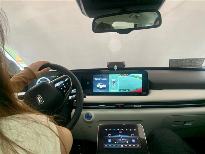 配置方面,車內(nèi)的三塊大屏非常吸睛,雙12.3英寸的液晶儀表盤+中控觸摸屏的組合,搭配一塊用以調(diào)節(jié)車燈、空調(diào)、座椅的小號(hào)觸摸屏,幾乎取代了全部實(shí)體按鍵,更具有科技感。E01還搭載了博世第五代雷達(dá)三代攝像頭及域控制方案,其中包括我們今天蒙眼挑戰(zhàn)應(yīng)用到的360度全景影像——如果將車四周的玻璃全部貼住,還能順利倒車入庫嗎?沒問題,360度全景影像把一切安排的明明白白!