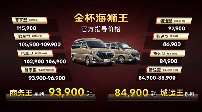 海獅王提供城運王和商務(wù)王兩個系列,共8款車型。提供不同的座椅布局方式,其中城運王系列提供2座/6座/10座布局;商務(wù)王系列提供7座/9座/10座布局。現(xiàn)場公布海獅王市場指導(dǎo)零售價8..49-11.59萬元。其中城運王系列售價為8.49 -9.79萬元,商務(wù)王系列售價為:9.39 -11.59萬元。同時,廠商還提供首購嘗鮮禮、金融貼息禮、質(zhì)保無憂禮等多種海獅王購車創(chuàng)富禮包。