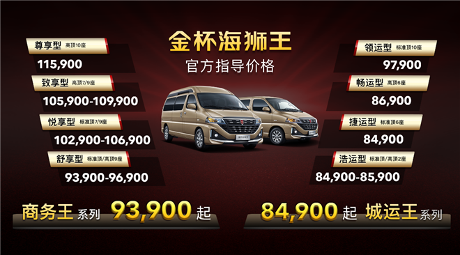 本次全新金杯海獅王共發布了城運王和商務王兩大系列,其中城運王系列涵蓋了領運型、暢運型、捷運型和浩運型,售價為84,900元-97,900元;商務王系列涵蓋尊享型、致享型、悅享型和舒享型,售價為:93,900元-115,900元。