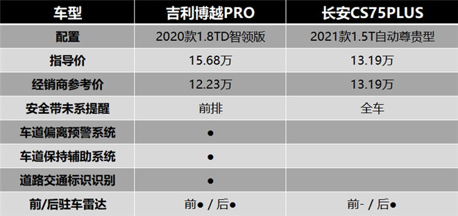 我們先來看看主動安全配置。以經銷商參考價相近的吉利博越PRO 2020款1.8TD智領版(以下簡稱博越PRO)和長安CS75PLUS 2021款1.5T自動尊貴型(以下簡稱CS75PLUS)來說,在兩車安全裝備差異不大的情況下,博越PRO比CS75PLUS多了車道偏離預警系統、車道保持輔助系統、道路交通標識識別和前駐車雷達,這還是在終端價格比CS75PLUS優惠1萬元的基礎上,而后者僅比博越PRO多了后排安全帶未系提醒,誰更厚道不用多說。