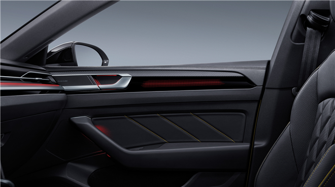 中期改款后,新CC的內飾工藝和材質全面升級,精致感再度進階。中控飾板使用碳纖維和真鋁,搭配高亮黑材質突出層次。并且,新CC具備30色可調內飾氛圍燈,IML工藝透光飾板可與儀表、中控屏聯動,形成環抱式燈光氛圍,配合 harman/kardon頂級音響效果,將賦予駕駛更多激情。